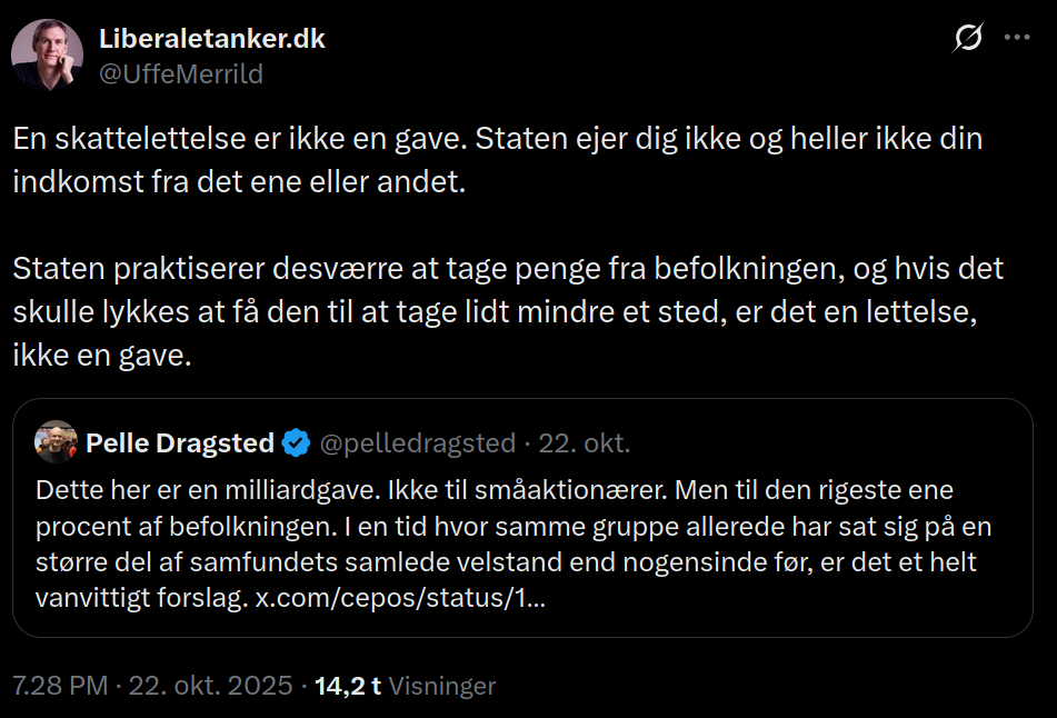 Mit tweet var et ganske simpelt angreb på ideen om, at beskatning er udgangspunktet, og enhver lettelse af dem er en gave. Du ejer med andre ord ikke din indkomst.